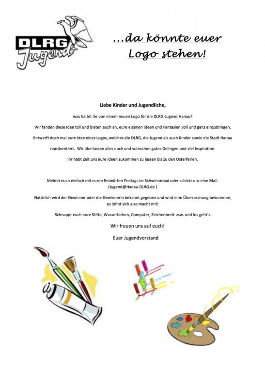 Hallo zusammen, die Jugend der DLRG OG Hanau möchte ein neues Jugendlogo entwerfen und dabei kommt ihr alle jetzt ins Spiel. Ihr dürft euch Ideen einfallen lass und sie uns zukommen lassen. Also nimmt Pinsel, Stift oder das, was auch immer ihr für die gesalltung eines Logos, braucht in die Hand und setzt eure kreativen Ideen um. Schön wäre es natürlich, wenn man in diesem Logo die DLRG Hanau und auch die Stadt Hanau wiedererkennt =) Wir freuen uns auf jeden Vorschlag der uns erreicht. Wie alles genau funkioniert könnt ihr der neben stehenden Ausschreibung entnehmen. Wir freuen uns über jede Idee. Solltet Ihr noch Fragen haben, stehen wir Euch gerne zur Verfügung. Mit kameratschaftlichen Grüßen Simon Oelmüller ... Mehr erfahren