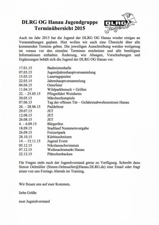 Terminübersicht 2015 und Start Jugendtagebuch