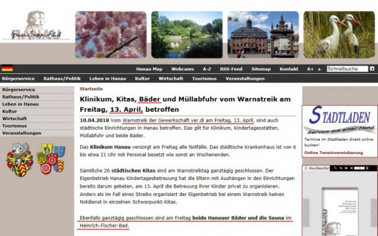 Aufgrund des Warnstreiks der Gewerkschaft ver.di am Freitag, 13. April, bleibt das Heinrich-Fischer-Bad an diesem Tag geschlossen. Daher wird an diesem Tag KEIN Vereinstraining stattfinden. Dies Betrifft natürlich nicht nur das Schwimmbad, daher hier noch mal der Link zur Pressemitteilung der Stadt Hanau für Euch, damit Ihr Euch einen Überblick verschaffen könnt, wovon Ihr eventuell ebenfalls betroffen seid. http://www.hanau.de/meta/adhoc/093451/index.html.de Wir bitten um Euer Verständnis und wünschen Euch ein schönes „verlängertes“ Wochenende. ... Mehr erfahren