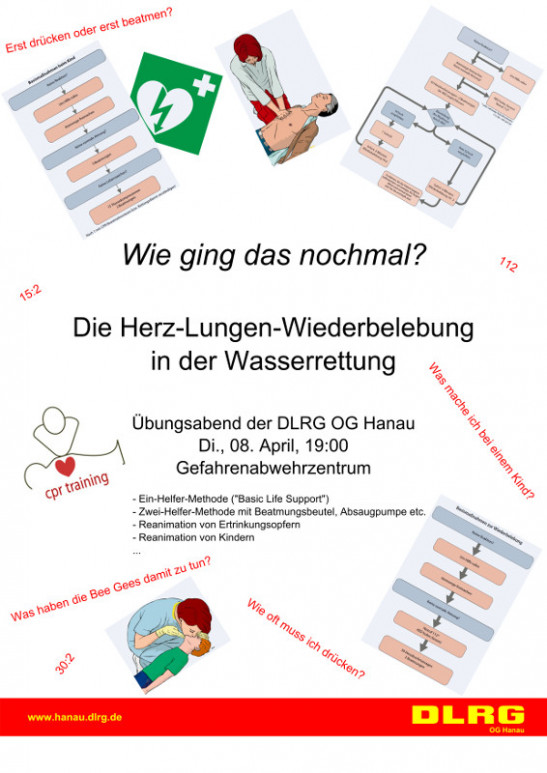 Wie ging das nochmal? Die Herz-Lungen-Wiederbelebung in der Wasserrettung Übungsabend der DLRG OG Hanau Di., 08. April, 19:00 - Ein-Helfer-Methode ("Basic Life Support") - Zwei-Helfer-Methode mit Beatmungsbeutel, Absaugpumpe etc. - Reanimation von Ertrinkungsopfern - Reanimation von Kindern ... ... Mehr erfahren